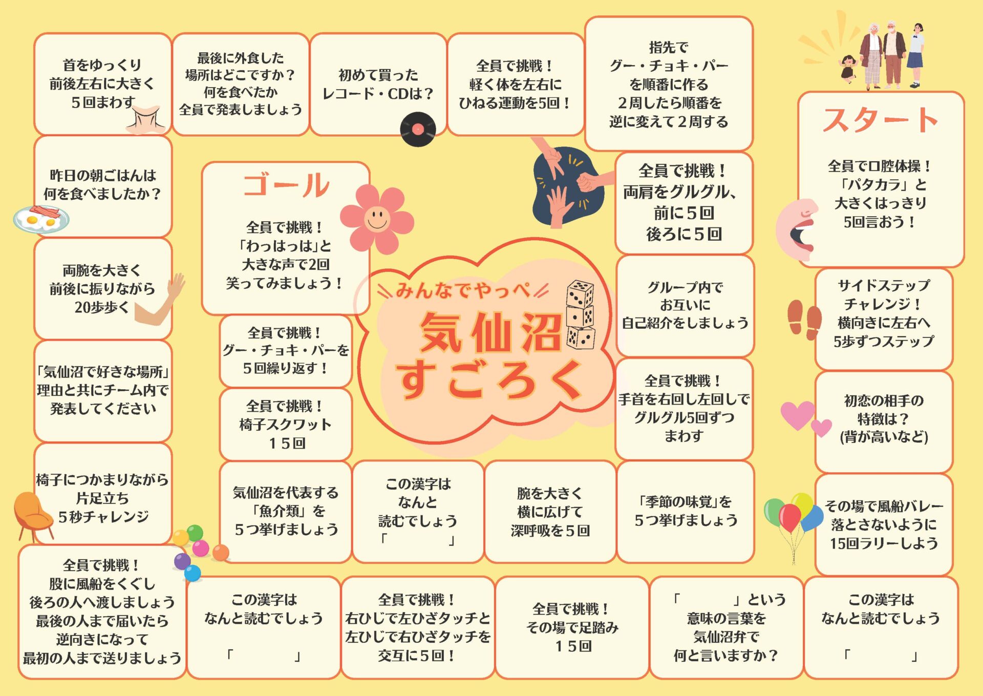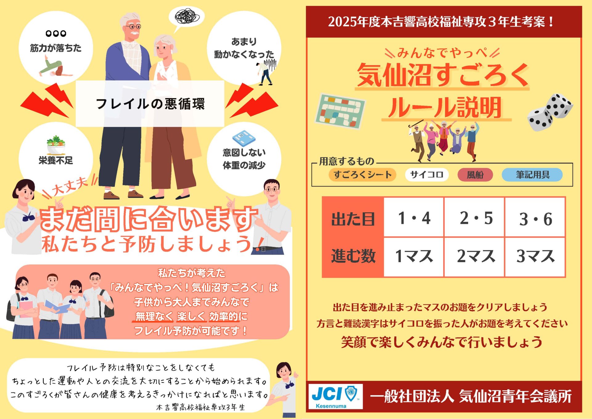 本事業では、本吉響高校福祉専攻3年生の生徒が考案したオリジナル競技「みんなでやっぺ!気仙沼すごろく」 を実施し、若者と高齢者が一緒に楽しめるよう、若者には高齢者疑似体験セットを着用してもらい、世代を超えてフレイル予防につながる運動を新しい形のニュースポーツとして大変盛り上がりました。